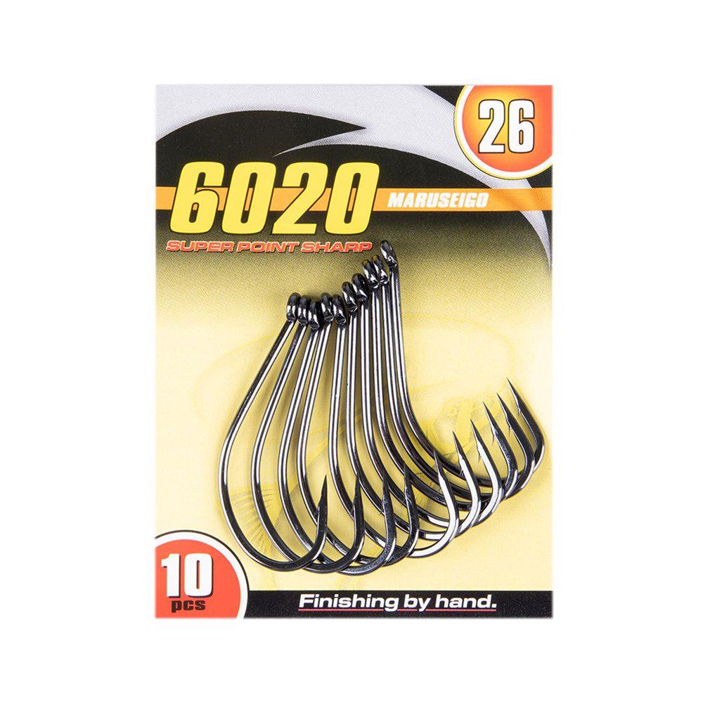 Anzol Maruseigo 6020 é um anzol de aço carbono, preto com ponta afiada quimicamente, muito forte e resistente.